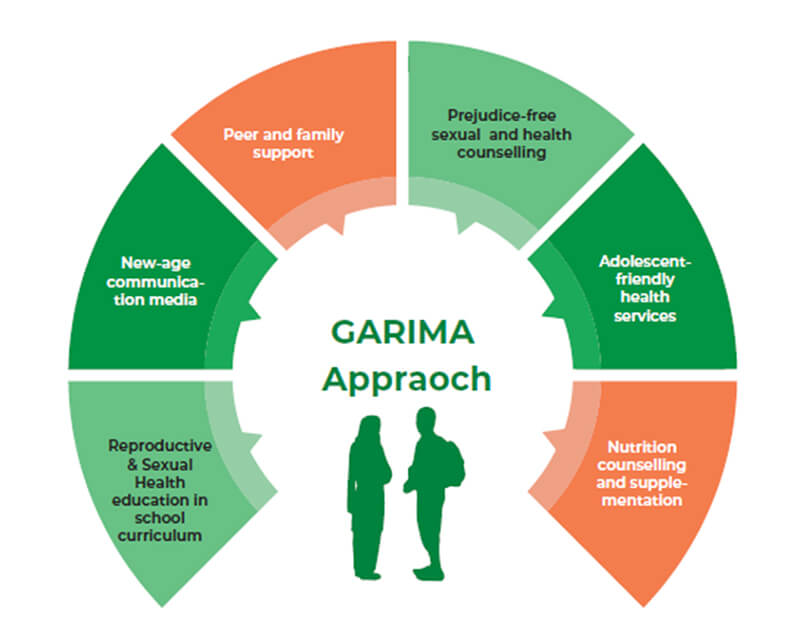 The Comprehensive Sexuality Education and Counseling reaches out to adolescents with comprehensive sexuality education and counseling through one-on-one sessions or group sessions via outreach clinics, government Primary Health Centers (PHCs), community health workers, and peer educators. The Jigyasa Centers are run by trained community-members, peer educators, and visiting doctors and provide non-judgmental health services such as counseling, OPD, and check-up; and refer cases to the Government ARSH clinics for health services. The Nutrition Counseling and Supplementation intervention works towards improving adolescents' nutritional intake by providing them nutrition counseling, fortnightly nutritional mix, nutritional supplements and link them with appropriate schemes for the provision of Iron folic acid tablets, etc. The Reduction in Anemia through Normative Innovations (RANI) intervention identifies anemic adolescents and provides the appropriate information and knowledge on nutrition, seasonal foods and food diversification, management of anemia at home, community, and Institution level. We also train communities to make affordable sustainable menstrual pads, train women and girls with correct disposal methods, etc for overall menstrual hygiene management.